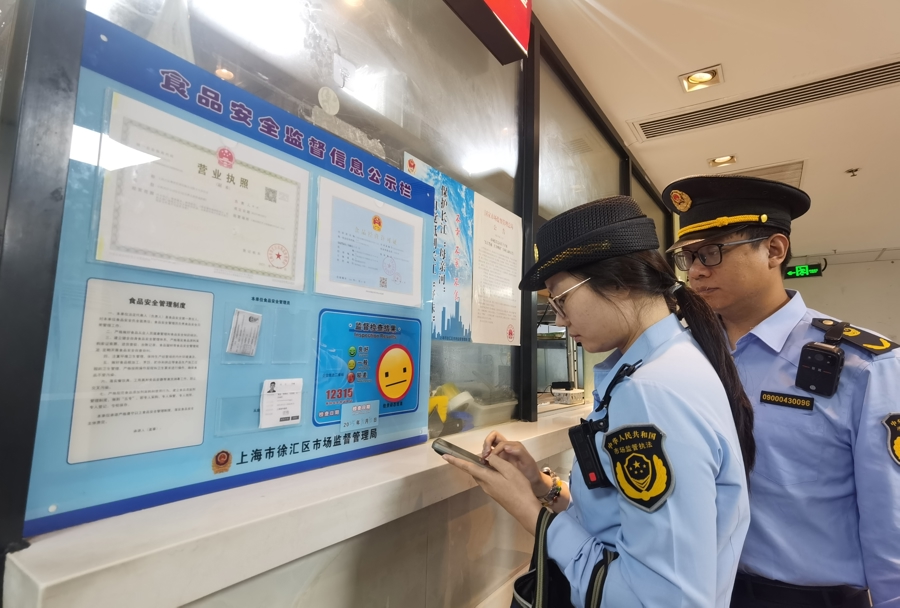 徐汇区市场监管局工作人员查验无堂食餐饮店许可情况,要求“一店一证”。 陈玺撼摄