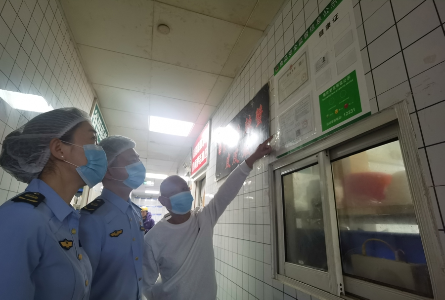 闵行区市场监管局工作人员查验无堂食餐饮店许可情况,要求“一店一证”。 陈玺撼摄
